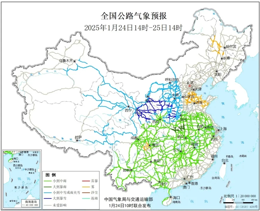 寒潮和大范围雨雪天气继续影响我国中东部地区,公路交通受阻的气象灾害风险高,关注雨雪、大风、低能见度天气对交通出行的不利影响。