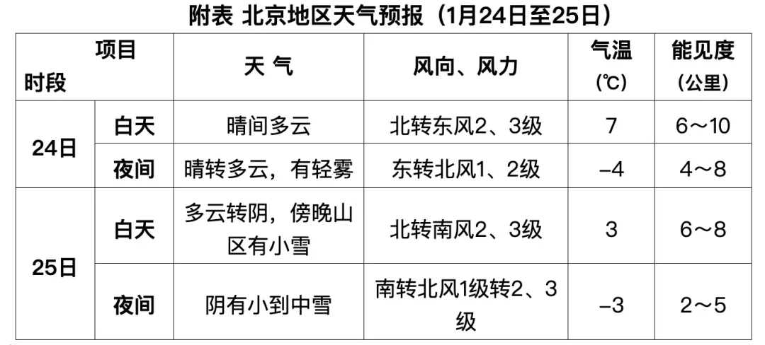 预计,24日北京地区天气为晴到多云,风力不大。受冷空气影响,25日白天天气转阴,气温下降;傍晚山区有小雪,夜间有小到中雪。该期间大气扩散条件及能见度较差,夜间有轻雾;白天最高气温7~3℃,夜间最低气温-3~-4℃(见附表)。