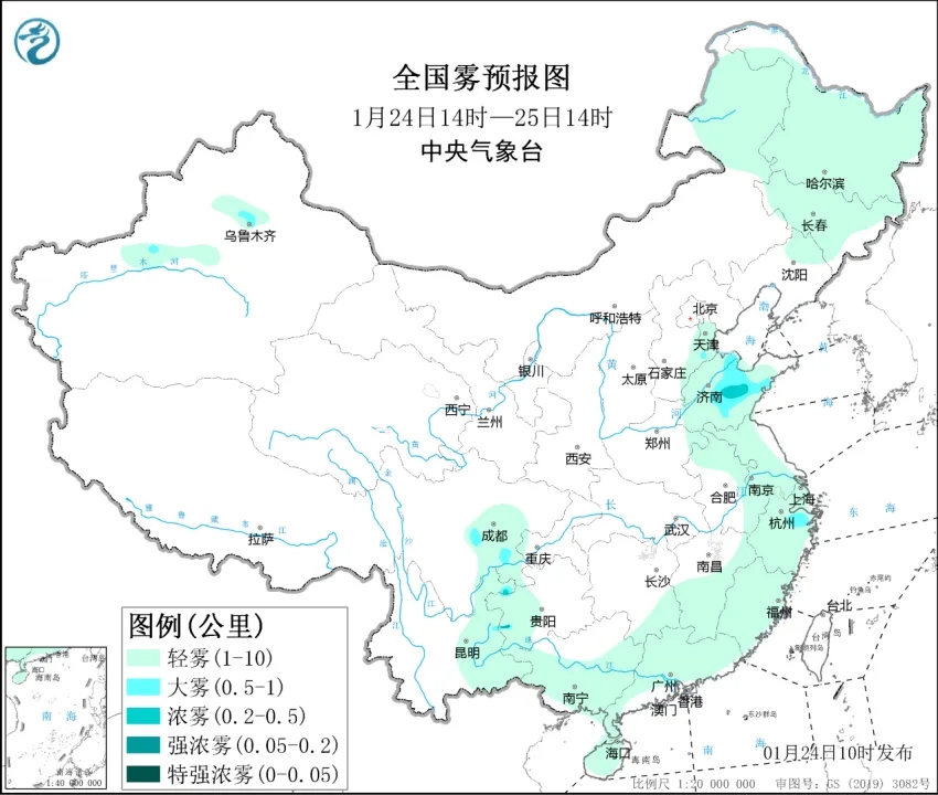 24日夜间至25日早晨时段,山东中部、浙江东部、四川盆地南部、新疆沿天山北坡等地的部分地区有大雾天气,局地有能见度低于500米的浓雾(见图1)。