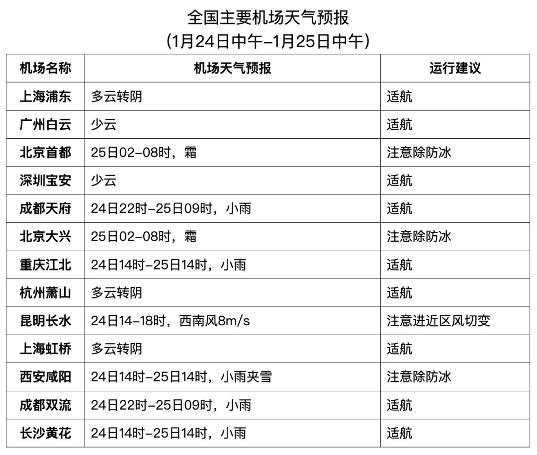 24日中午至25日早间,西宁、兰州等机场有小雪,西安机场有小雨夹雪;24日夜间至25日早间,银川机场有小雪;25日凌晨至早间,哈尔滨、长春、沈阳、北京两场、石家庄、天津、济南、青岛等机场有霜。