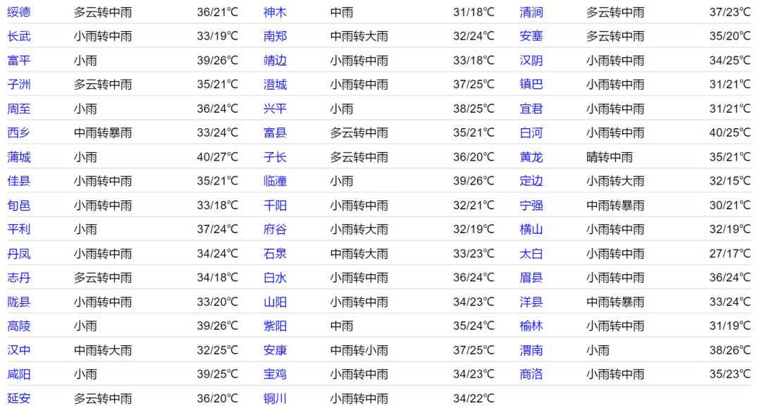 (其中陕北部分地方和汉中西部有暴雨,局地有大暴雨,并伴有雷电和短时强降水,最大小时雨强30~40毫米)