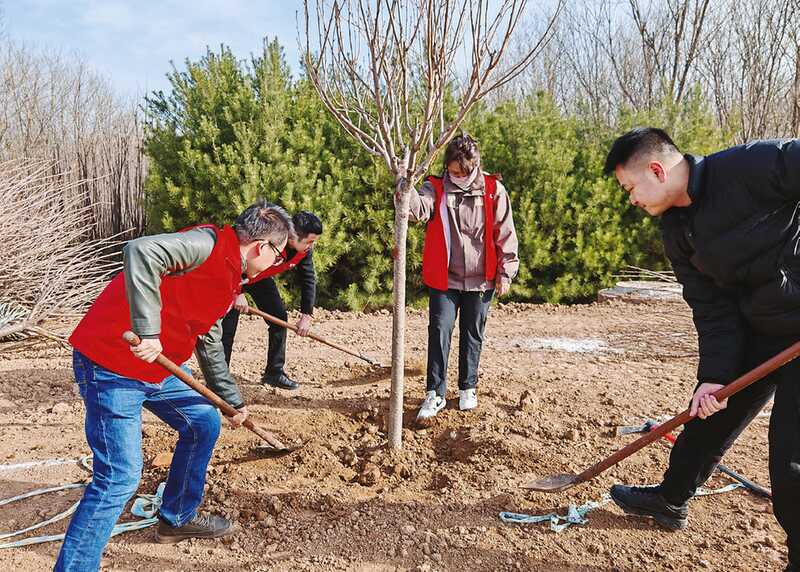 当天上午,阳光和煦、清风徐来,大家三五成群,挥锹铲土、扶苗填坑、提桶浇水,共栽植樱花、金叶女贞、独杆月季等树苗1500多株。放眼望去,一棵棵新植的树苗傲立在春风之中,勾勒出一幅充满希望的绿意画卷。