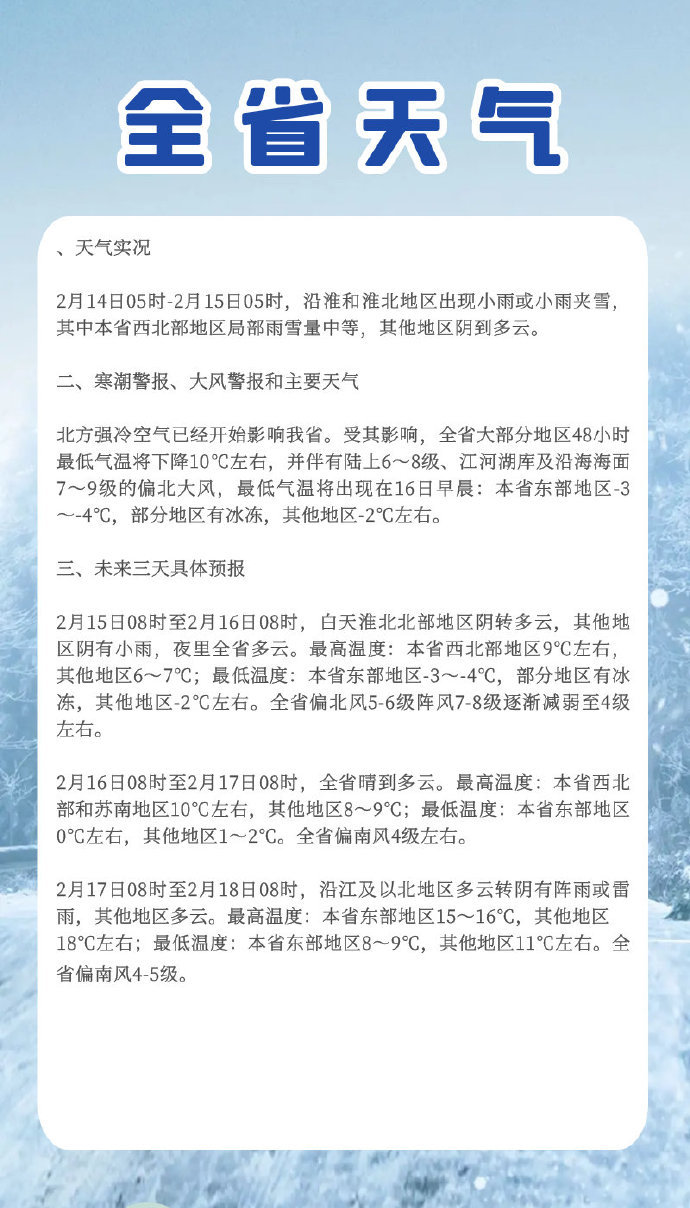 2月15日08时至2月16日08时,白天淮北北部地区阴转多云,其他地区阴有小雨,夜里全省多云。最高温度:本省西北部地区9℃左右,其他地区6~7℃;最低温度:本省东部地区-3~-4℃,部分地区有冰冻,其他地区-2℃左右。全省偏北风5-6级阵风7-8级逐渐减弱至4级左右。