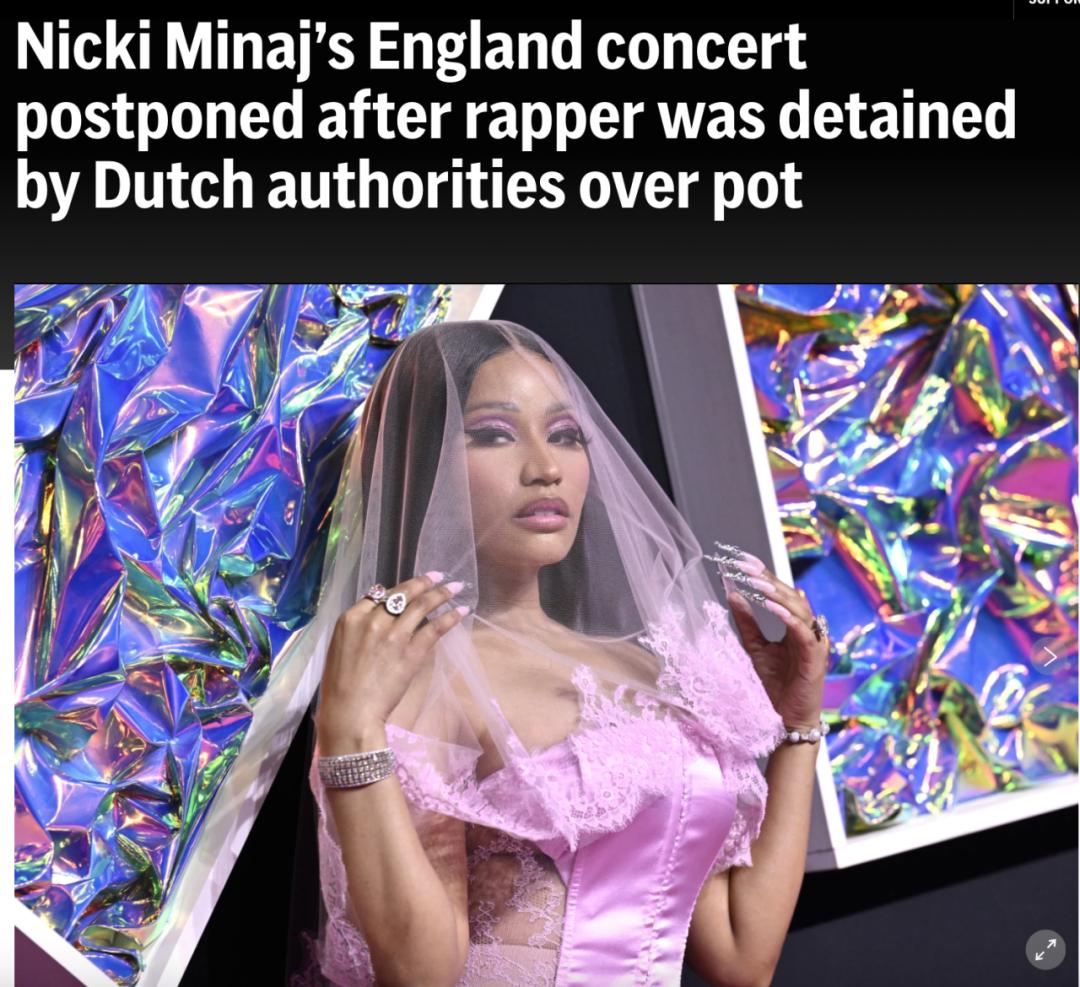 据美联社26日报道,美国知名歌手“麻辣鸡”妮琪·米娜(Nicki Minaj)在荷兰机场准备飞往英国曼彻斯特举办演唱会时,被当地警方逮捕,因为她的行李箱中藏有大麻。据称,荷兰警方拘留她的原因是她的行李箱里涉嫌携带违禁物品(大麻),但妮琪本人否认。据悉,妮琪交了一笔罚款后得以释放,但当天的演唱会被迫取消改期。演唱会主办方表示,演出将重新安排,门票仍然有效。