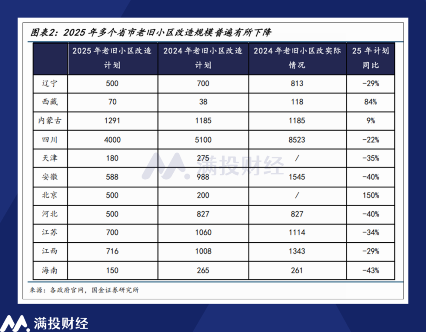 值得一提的是,尽管在2025年地方两会的规划上,有超过70%(22个)省市明确提出了城市更新计划行动。但国金证券统计各省市披露的2025年老旧小区改造计划规模却有普遍的下降。或许在原本的规划中,对城中村的城市更新以及收储是各地拟划的重点方向,而本次住建部的表态是超出市场预期的信号,或能成为地产行业景气复苏的“意外惊喜”。