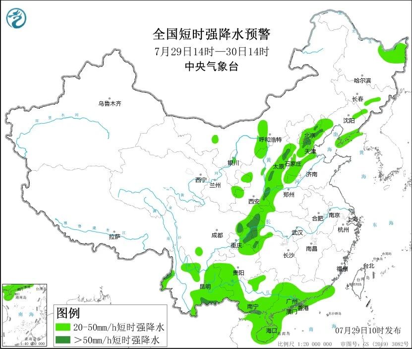 预计7月29日14时至30日14时,内蒙古东北部和西部、吉林中部、辽宁东部和西南部、河北中部、天津北部、山西中南部、陕西中部、宁夏北部、甘肃中部、重庆中部、湖南西北部等地的部分地区将有8级以上雷暴大风或冰雹天气;黑龙江东北部、吉林东部、辽宁东部和西部、北京中东部、天津、河北、山西中南部、内蒙古中西部、陕西中南部、宁夏北部、甘肃东北部、河南西部和北部、湖北西部、重庆中东部、湖南西北部、四川东北部和南部、贵州南部和北部、云南西北部和东部、广西、广东中南部、海南岛等地的部分地区将有小时雨量大于20毫米的短时强降水天气,其中,河北东北部、北京东部、天津北部、山西中部偏东地区和西南部、陕西东南部、重庆东北部和南部、四川东北部、广西东南部、广东南部、云南东南部等地的部分地区小时雨量大于50毫米,最大可达80毫米以上。