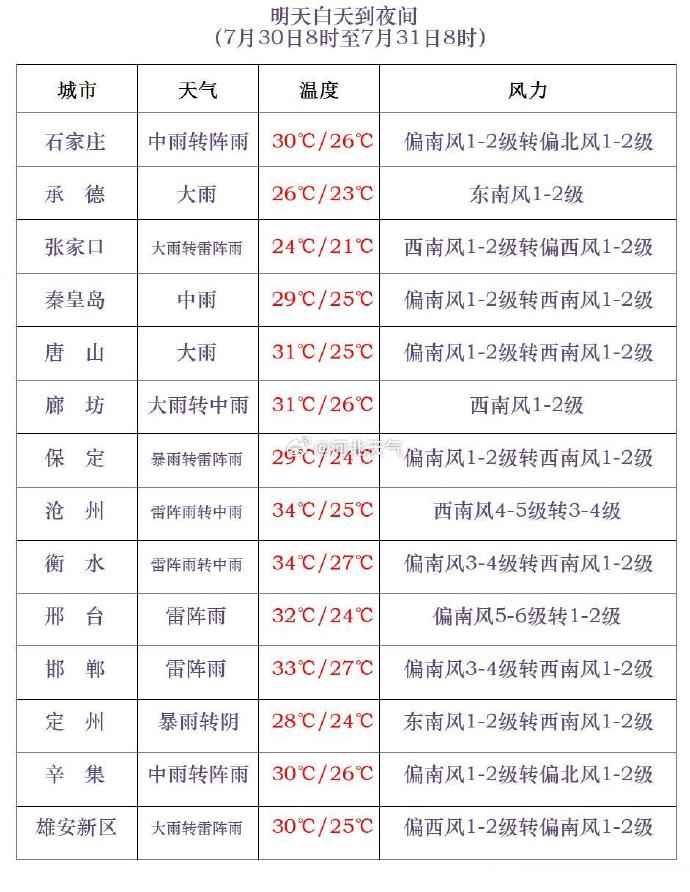 明天白天,全省阴,大部分地区有雷阵雨或阵雨,其中张家口中东部、承德、唐山北部、秦皇岛、保定、雄安新区、廊坊、石家庄、沧州西部、衡水北部有中雨到大雨,局地有暴雨,个别地点有大暴雨,雷雨时局地伴有短时强降水、短时大风等强对流天气。