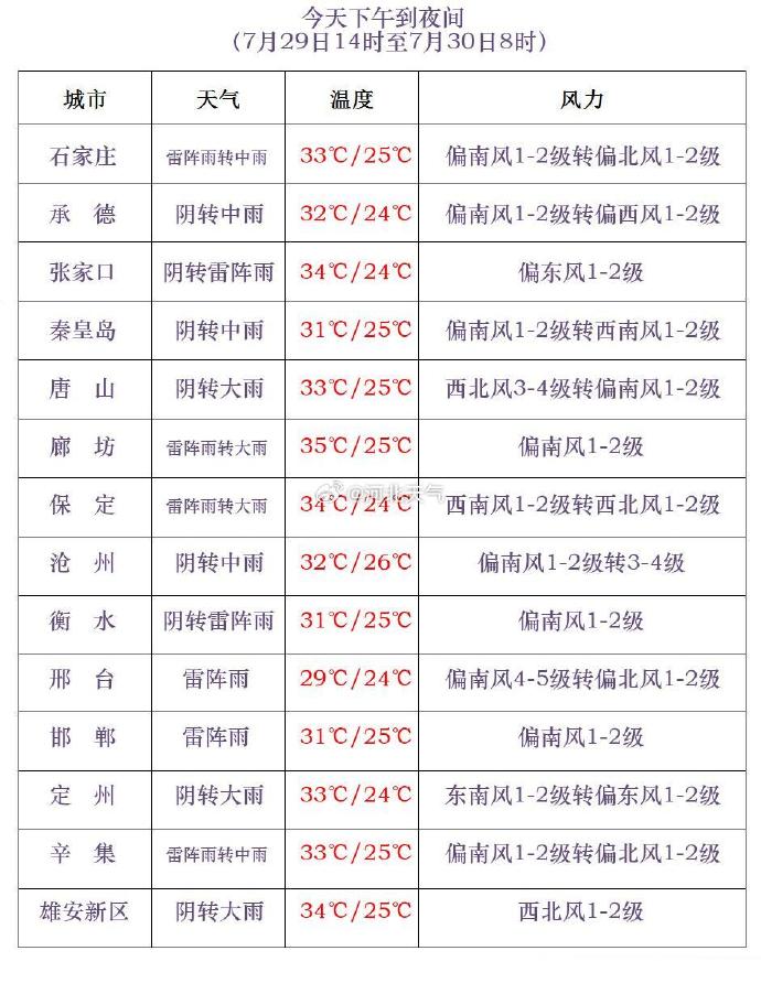 今天下午到夜间,全省阴,大部分地区有雷阵雨或阵雨,其中张家口中南部、承德南部、唐山、秦皇岛、保定、雄安新区、廊坊、石家庄、沧州、衡水北部、邢台中东部有中到大雨,局地有暴雨,个别地点有大暴雨,雷雨时局地伴有短时强降水、短时大风等强对流天气。最高气温,张家口中南部、承德中部、廊坊、唐山中北部、秦皇岛西部、保定、石家庄中北部33~35℃,其他地区26~32℃。最低气温,张家口北部、承德北部、保定西北部17~21℃,其他地区22~26℃。