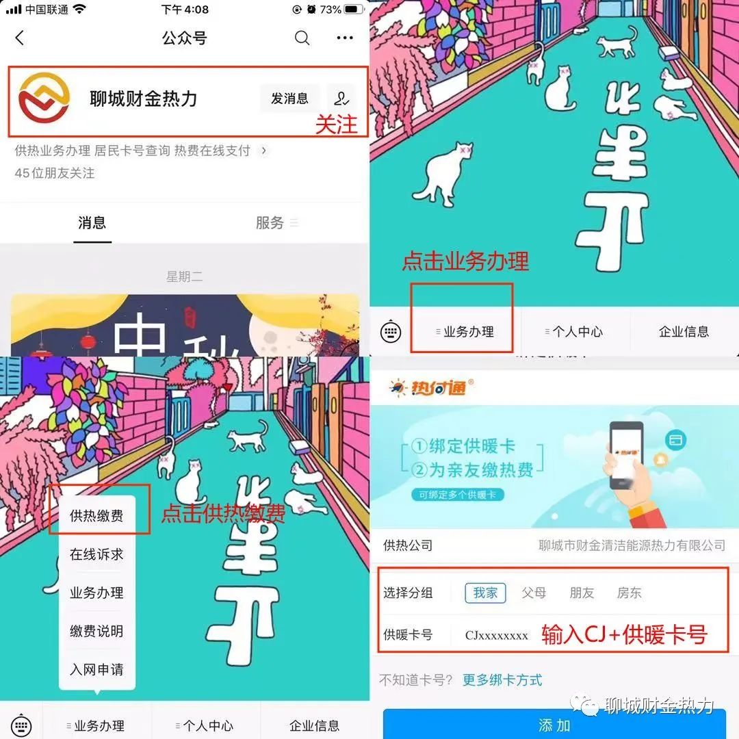 (1)微信公众号交费:关注“聊城财金热力”微信公众号--点击业务办理--供热缴费 --输入“CJ+供热缴费卡号”-根据提示进行缴费;