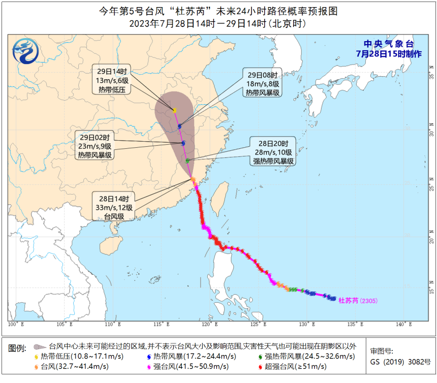 今年第5号台风“杜苏芮”(DOKSURI)的中心已于今天(28日)上午9点55分前后在福建省晋江市沿海登陆,登陆时由超强台风级减弱为强台风级,中心附近最大风力有15级(50米/秒),中心最低气压为945百帕。10点钟其中心位于福建晋江境内,就是北纬24.7度、东经118.6度,最大风力有15级(50米/秒),中心最低气压为945百帕。