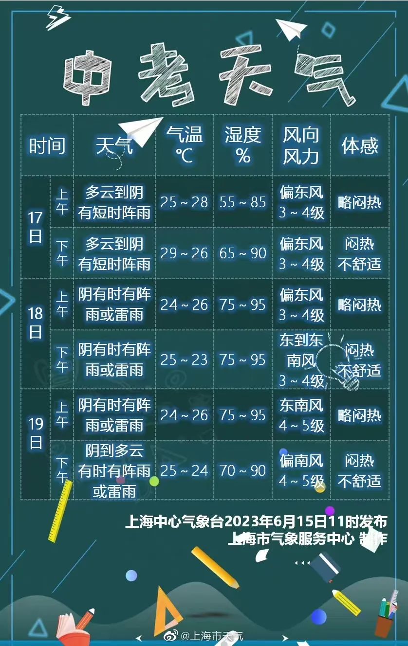 2023年上海中考期间,18-19日降水较为集中,并可能伴有雷电、短时强降水和雷雨大风等强对流天气;温度在23~29度之间,湿度大,体感总体闷热。