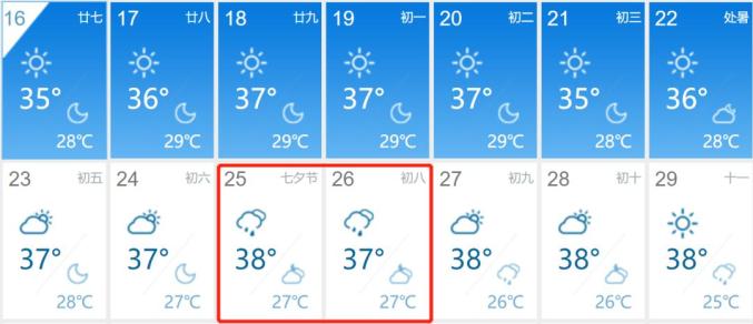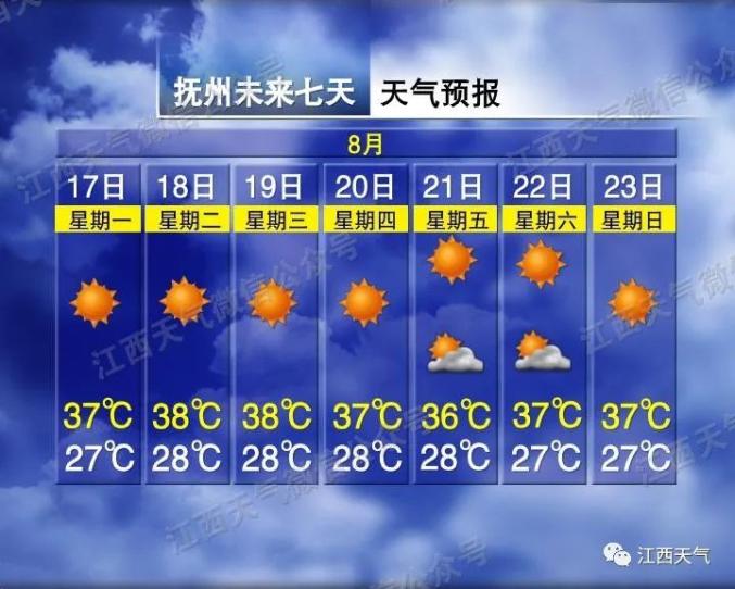 20日~23日:全省维持晴热高温天气,局部山区午后到夜间有阵雨或雷阵雨;最高气温全省36~38℃,局部39℃。