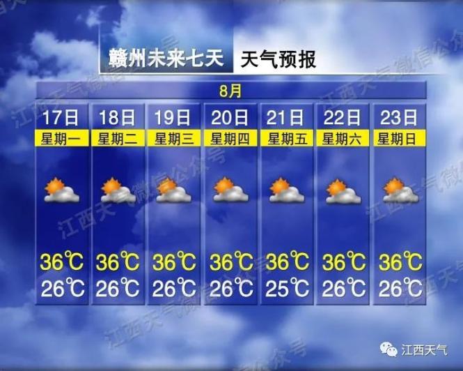 19日:副高加强西伸,全省晴热高温,赣南和赣中西部局部地区午后到夜间有阵雨或雷阵雨。