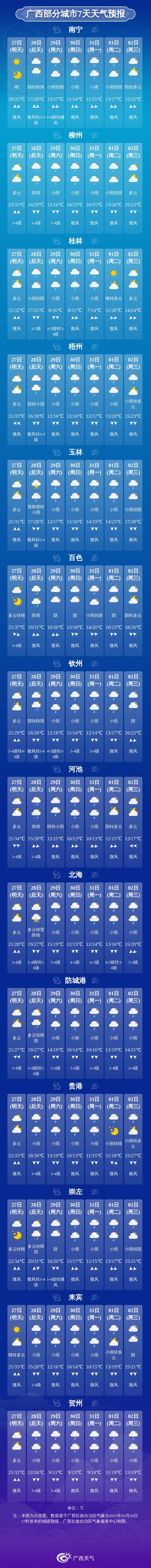 27-30日,受冷空气影响,各地气温下降10~12℃、局地16℃以上,沿海和桂东部分地区有5~6级、阵风7~8级偏北风。