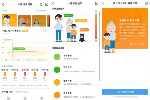 在出行途中,高温天气下的中暑风险不容忽视。墨迹天气预报APP特别推出“中暑预报”功能,该功能综合空气温度、湿度、风速以及天空云量、日照时数等因素,通过大数据分析总结出精准的体感温度,并针对体感温度数据给出科学的防暑措施建议,帮助用户降低中暑的风险。此外,该功能还结合不同群体的特点,细分了“成人”“老人孩子”“户外”“宠物”四个类别,满足用户不同的需求。