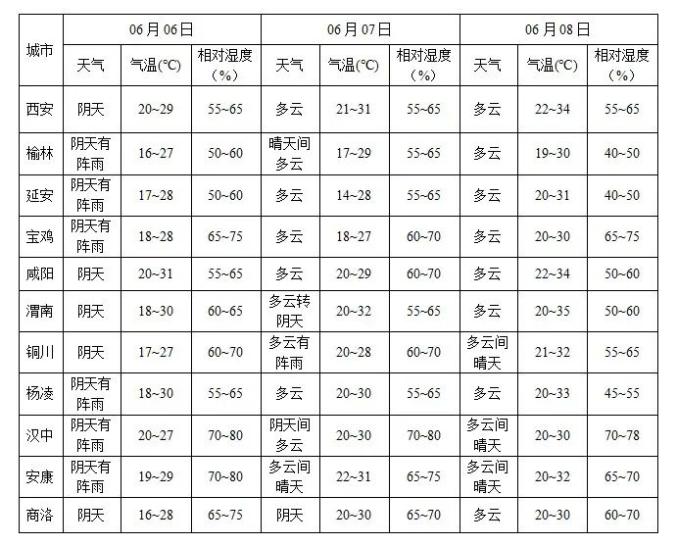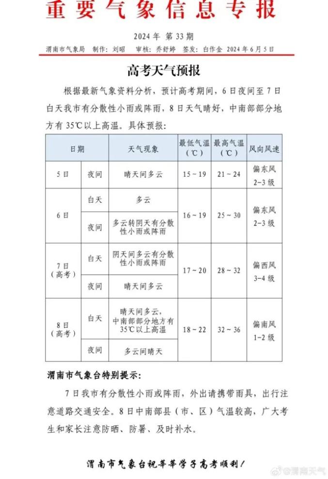 高考期间,6月7日、8日全省以多云天气为主,部分地方有分散性阵雨。8日午后陕北黄河沿线局地、关中东部局地有35℃以上的高温天气。