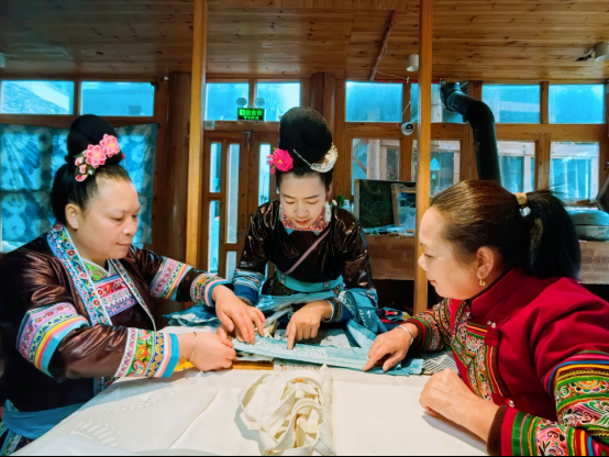 ▲90后侗族女大学生唐玉蓉(中间者)返乡开民宿,并将“侗族豆染”发扬光大(图源:贵州省黎平肇兴侗寨 嗨来学民宿)