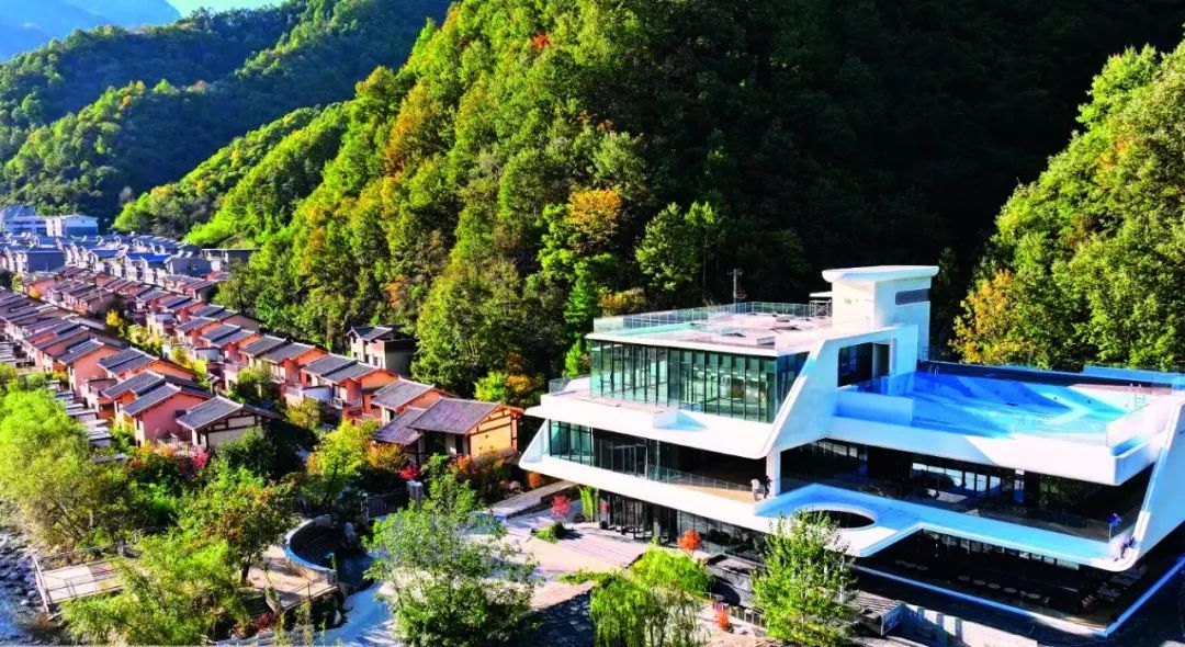 柞水县营盘镇朱家湾村终南山寨景区里的度假酒店绿树掩映,景色宜人。