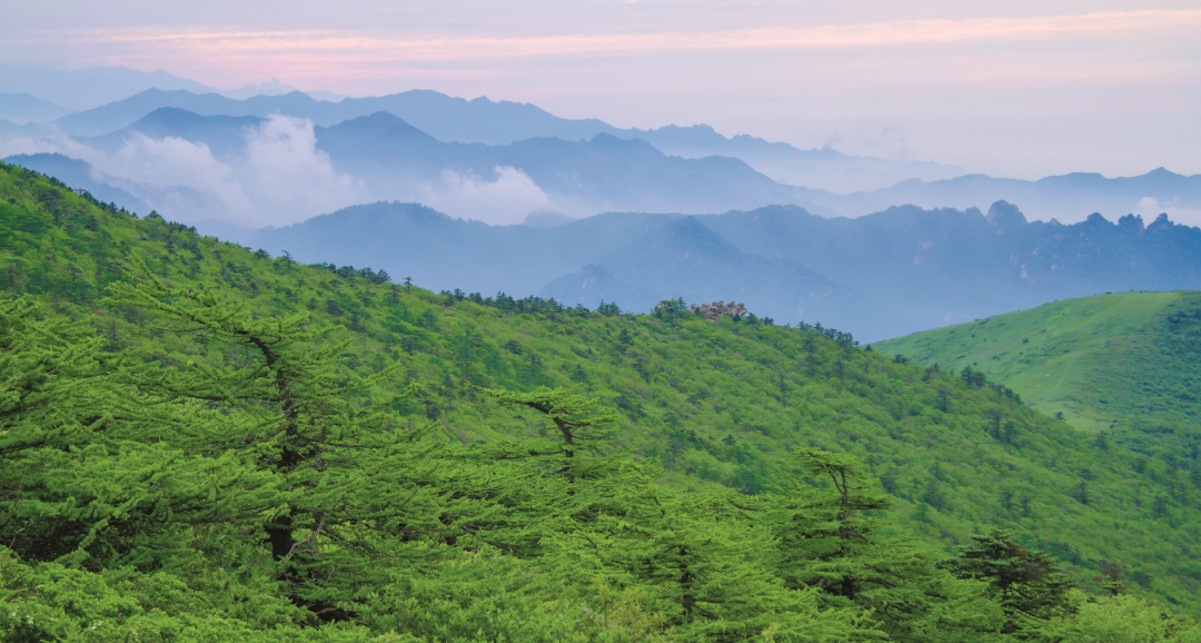 秦岭牛背梁主峰巍峨耸立,云雾缭绕。山峦起伏间树木葱茏,清风拂过,松涛阵阵,尽显大自然的雄浑与壮美。