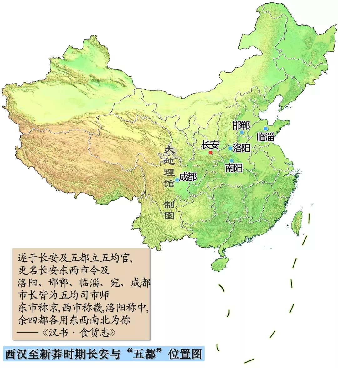 东汉班固在《汉书·食货志》中,对西汉时期的重要都会地位进行了明确记载,将西汉至新莽时期的五大重要城市称为“五都”(长安、洛阳除外),这五大城市是:洛阳、邯郸、临淄、宛、成都。