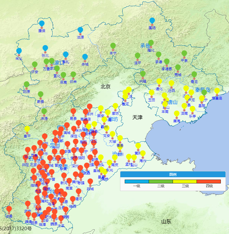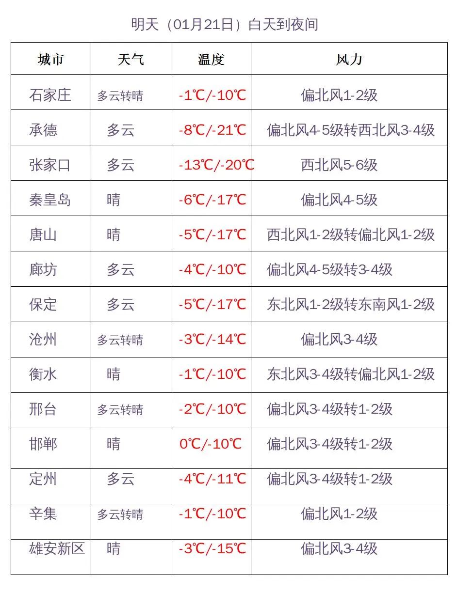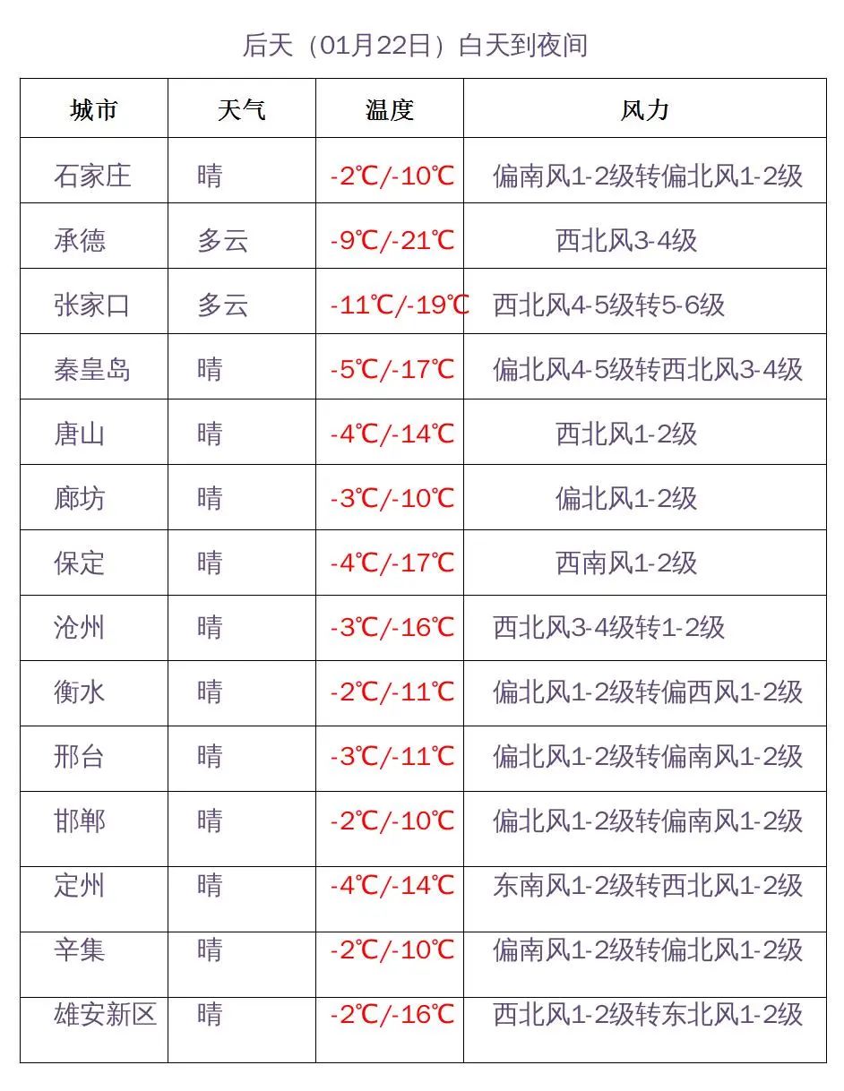 21-22日,张家口、承德、保定西部有北到西北风4到5级,阵风6到8级;渤海海域和沿海地区有偏北风5到6级,阵风7级。