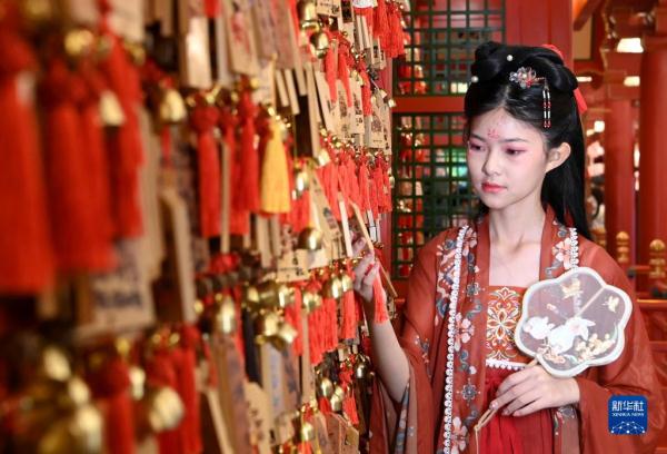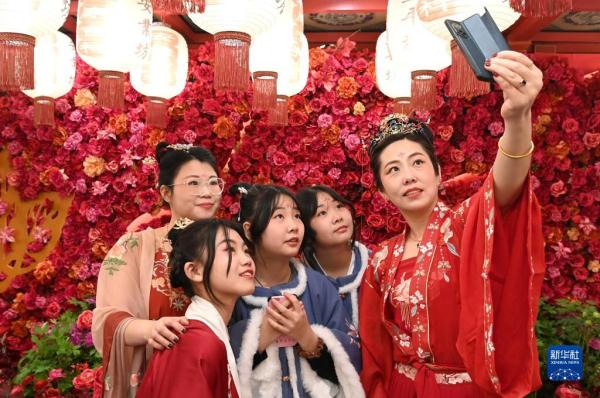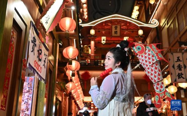 春节期间,位于西安曲江新区的“长安十二时辰”沉浸式唐风市井生活街区迎来旅游高峰。在这个涵盖唐食荟萃、百艺手作、文化宴席、沉浸演艺等多种业态的街区里,许多游客身着汉服、绘上美妆,游览、留影,感受大唐风貌,体验“唐潮”之旅。