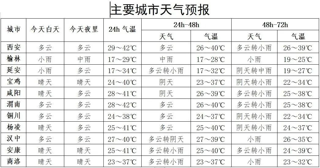 陕北北部、商洛有小到中雨、局地大到暴雨,陕北南部、关中东部部分、汉中东部、安康大部有小雨或阵雨。关中大部、陕南大部有35℃以上高温天气,关中南部、陕南南部最高气温可达38~40℃。