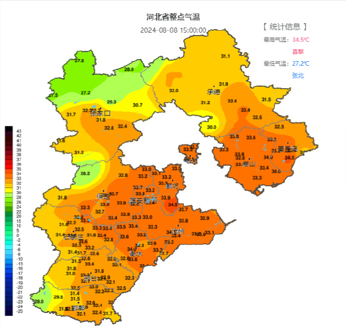 河北大部气温都在30~34 ℃左右