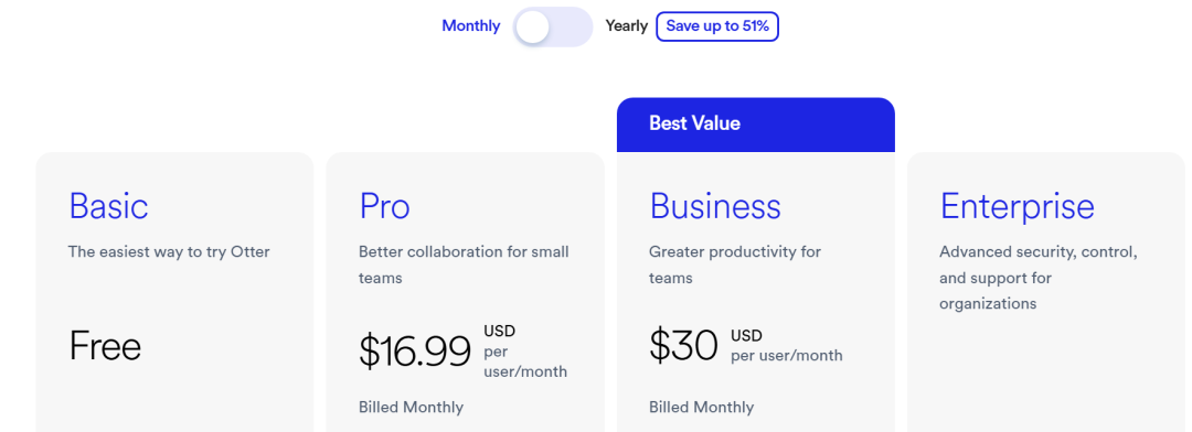 在价格方面,Otter.ai 同样采用了极具诱惑的付费策略,如果按月付,30 美元/用户/月,如果按年计费,价格则降低至 20 美元。