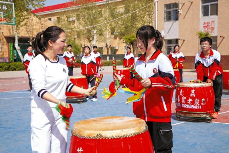 【南留锣鼓进校园】4月11日,在大荔县韦林初级中学操场上,省级非物质文化遗产南留锣鼓传承人指导学生打鼓。南留锣鼓发端于明朝、成熟于清朝,因起源于原朝邑县南留村而得名。近年来,该校以鼓为媒,推动南留锣鼓从“静态保护”转向“活态传承”。通过组织学生参与“非遗文化节”“黄河鼓乐大赛”等活动,让学生在敲击锣鼓中学会团结协作,传承优秀传统文化。