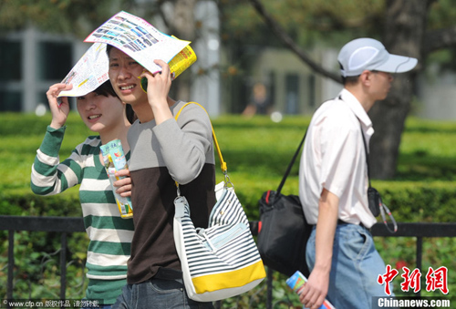 这两天,北京最高气温突破30℃,图为2012年5月2日,市民顶着烈日出行。图片来源:CFP视觉中国