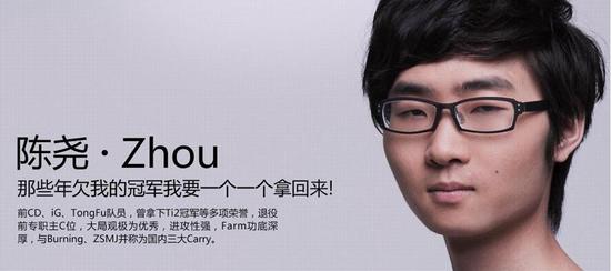 Zhou最早成名于CD战队,当时CD的战术就是名噪一时的“玩命4保zhou”,创造了CD的草根神话。全能carry,法系核玩的很好战术体系非常多,推进和gank都很好,最强的还是反保全队。