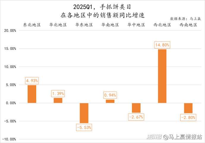 从地区角度观察,2025年Q1手抓饼类目销售额同比增速分化明显,除华南外整体呈现出“北增南降”的态势。东北、华北、华南、西北地区均有增长,西北地区增长突出,销售额同比增速达14.80%。而华东、华中、西南地区出现不同程度的小幅度下跌。