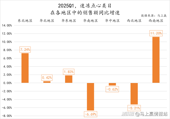 分地区来看,2025 年Q1速冻点心类目销售额同比增速呈现出明显差异,不同于其他类目的整体下跌,速冻点心类目在多个地区呈现上升态势,其中西南地区一马当先,销售额同比增速高达 11.20%,东北地区表现也较为突出,华北、华东地区增速相对和缓。而华南、华中和西北地区则呈现负增长态势,其中华南和西北地区下跌较为严重。