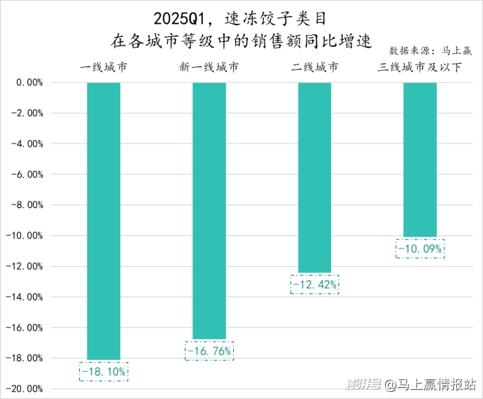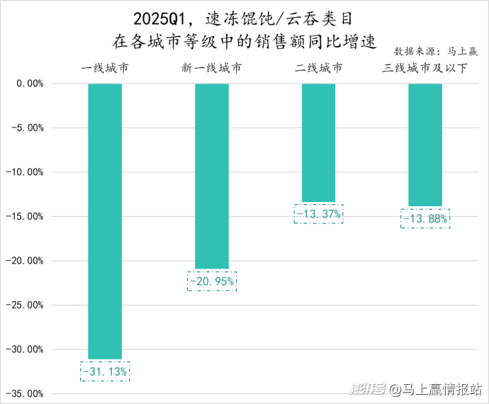 另一方面,从城市等级的角度看,速冻馄饨/云吞在不同级别城市销售额均呈下跌态势。一线城市和新一线城市的销售额同比下滑较为严重,跌幅高达31.13%和20.95%,二线城市和三线及以下城市的跌幅相对较小,但也超过13%。