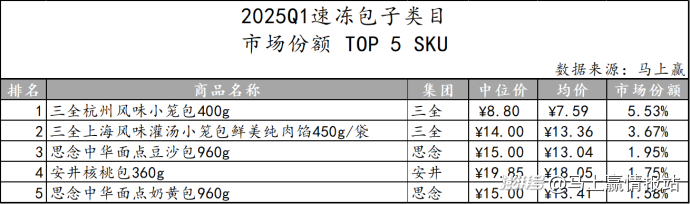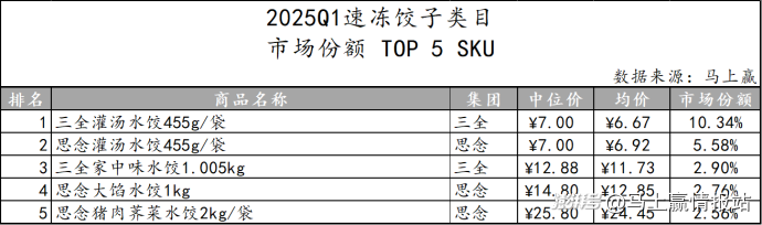 在刚刚过去的2025年Q1,速冻饺子类目市场份额TOP 5 SKU仍由三全、思念两家产品占据。三全旗下的灌汤水饺更是在与思念旗下同类商品的价格、规格均相近的情况下,占据高达10.79%的市场份额。而思念集团则以多种口味、规格和价格的产品占据三个席位,可见思念在产品布局方面的显著优势。