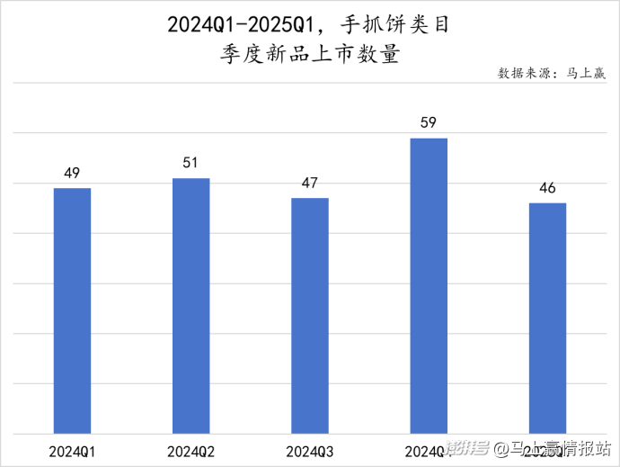 手抓饼类目的季度新品上市数量规模相比速冻食品其他类目而言较小,或是由于一方面是类目整体占比较小,另一方面产品类型上整体也较为单一。在过去五个季度中,最多在2024年Q4推出59款,其余季度均在50款左右徘徊,整体来看,手抓饼类目新品数量未呈现明显持续增长或下降趋势。