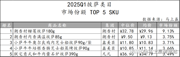 与CR5集团归属类似,披萨类目的TOP 5 SKU中,行业巨头三全、思念甚至安井都没有产品出现。潮香村和鑫美臣各有两款产品位列其中,其中潮香村的榴莲披萨以9.13%的市场份额占比成为热门单品。凡凡旗下的“意式和牛酱石炉披萨”也以独特的口味和大规格的特征跻身第五位,TOP 5 SKU的归属也一定程度上反映出披萨类目市场中其他企业仍有较大的竞争空间。