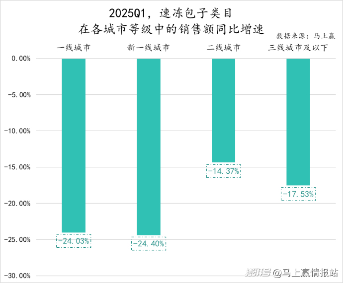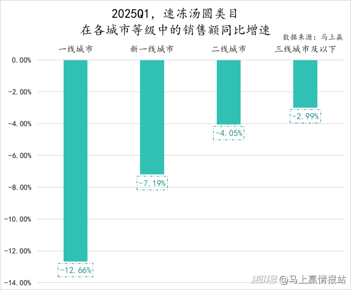 从城市等级角度来看,2025年Q1速冻汤圆类目在各城市等级的销售额同比增速均不容乐观。其中,一线城市最为严重,下跌幅度高达12.66% ,新一线城市、二线城市和三线城市及以下均有不同程度的下跌,下跌幅度与城市等级呈现负相关关系,即城市等级越高,下滑程度越严重。