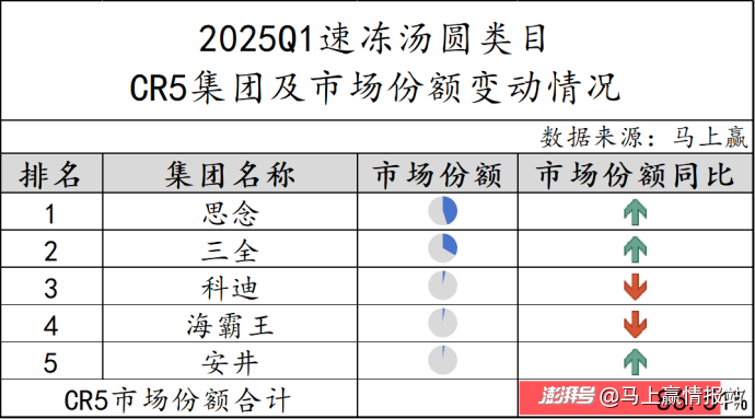 在市场份额占比最高的速冻汤圆类目中,CR5集团的市场份额之和达到了86.51%,整体集中度较高。类目市场份额绝大部分集中于思念与三全两大巨头,竞争格局基本延续“双雄”格调,且两者的市场份额同比均有增长,展现出持续增强的类目掌控力。相比之下,科迪与海霸王在本季度市场份额出现下滑,而“安井”虽排名第五,但市场份额同比仍实现增长,在速冻汤圆赛道中具备一定潜力。