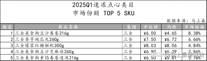 基于市场份额 TOP 5 SKU 的集团归属,三全旗下产品强势占据所有席位,其在速冻点心赛道的市场掌控力可见一斑。从商品口味来看,豆沙春卷、香芋地瓜丸等多种传统甜味点心占据主导,素馅春卷这类咸味点心也进入榜单,可以看出传统口味的产品在市场上具备较强竞争力,但创新口味的速冻点心或许还有较大的空间。