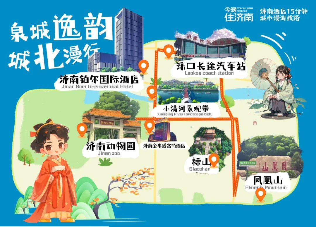 线路点位:济南铂尔国际酒店→小清河景观带→济南动物园→标山→凤凰山→泺口长途汽车站→济南铂尔国际酒店