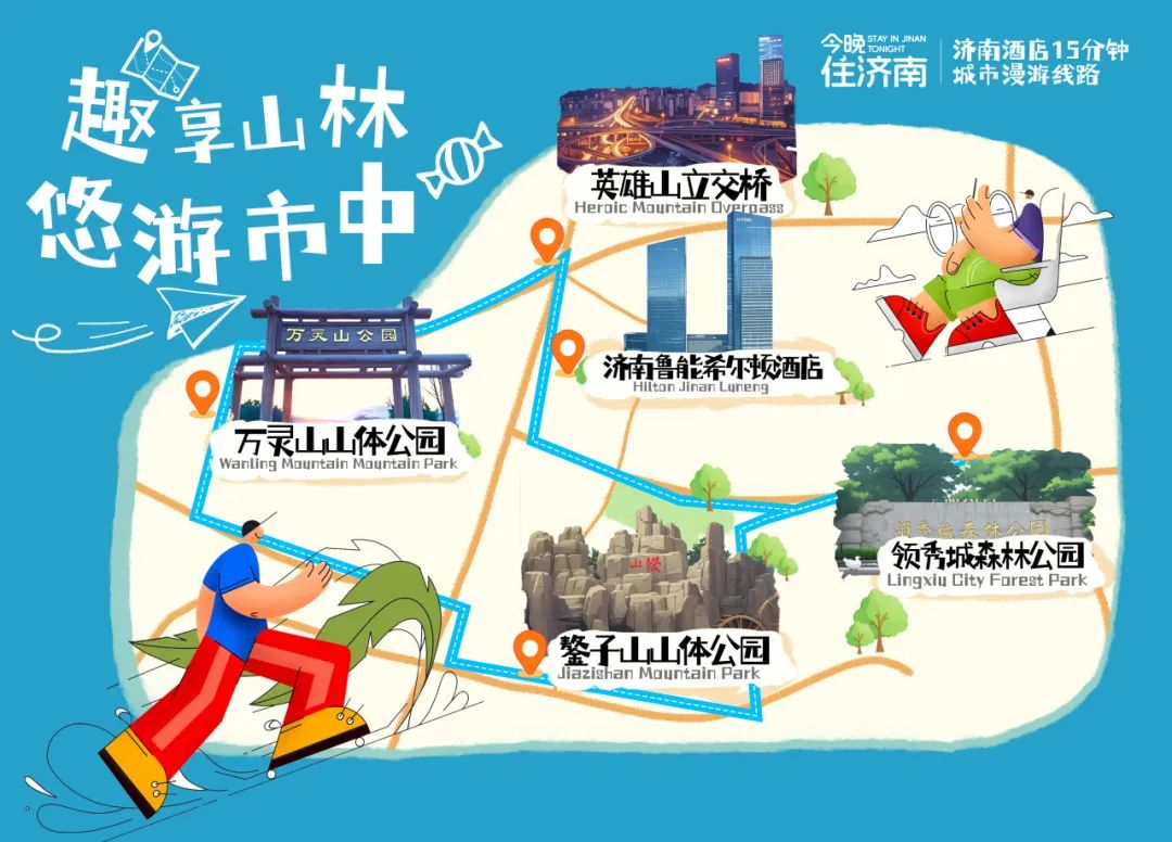 线路点位:济南鲁能希尔顿酒店→领秀城森林公园→鏊子山山体公园→万灵山山体公园→英雄山立交桥→济南鲁能希尔顿酒店