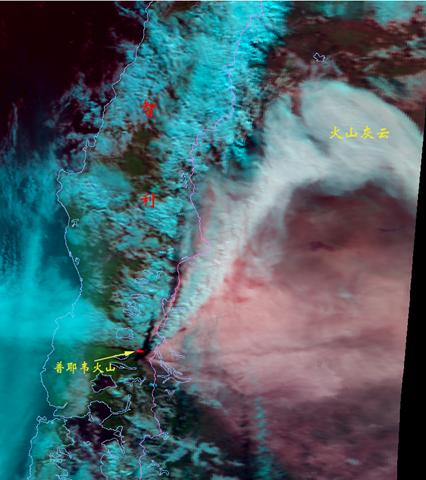 图26 FY-3A/MERSI智利普耶韦火山灰云监测图2011年6月6日13:40(世界时)