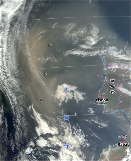 由于弱冷空气的活动,4月6号夜间北非出现沙尘天气。22:35 FY-3B气象卫星监测显示(图9):影响摩洛哥、阿尔及利亚等国的沙尘天气已经加强,并且随天气系统向西北方向蔓延,沙尘层已经越过伊比利亚半岛,向北大西洋中部海域扩散。
