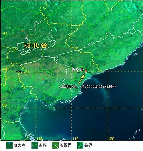 图18 FY-1D气象卫星河北省秦皇岛市抚宁县火情监测图2011年4月15日15:03(北京时)