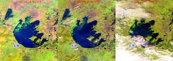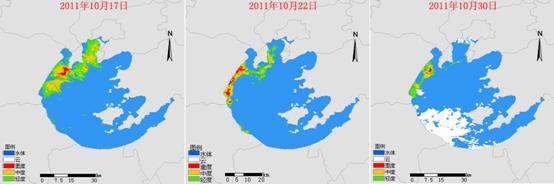 蓝藻监测2011年10月太湖水域共监测到7次蓝藻水华信息,强度普遍较弱,蓝藻主要出现在湖区的西北部,其中10月17日的蓝藻水华影响面积最大,约344平方公里。图16、17是太湖蓝藻监测图像以及强度示意图。