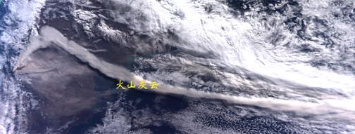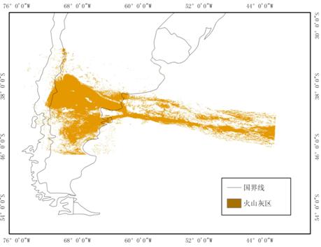 图27为利用6月6日13:40分(世界时)FY3A/MERSI和VIRR资料提取的智利普耶韦火山灰云信息专题图。图中可见,在火山口以东形成大范围火山灰云,之后火山灰云成细条带状向东漂移。