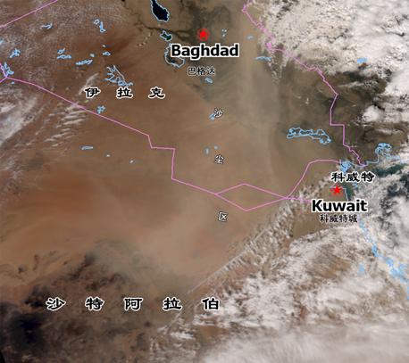 中东、北非地区出现沙尘天气我国FY-3A气象卫星2012年4月5号下午(北京时)监测到中东地区出现沙尘天气。当地的沙尘天气主要起源于伊拉克境内以及沙特北部地区(图8),沙尘区逐渐越过巴格达上空,向下游的科威特蔓延。