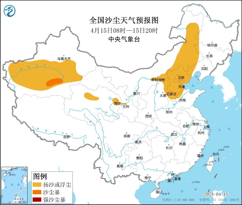 受较强冷空气影响,15日,内蒙古中东部、华北、东北地区等地有大风降温、部分地区沙尘以及小到中雨天气,并有4~6℃,局地可达8~10℃降温。其中,4月15日08时至20时,新疆南部、青海北部、内蒙古东部、山西北部、北京、天津、河北、吉林西部、辽宁西部等地的部分地区有扬沙或浮尘天气,其中新疆南部局地有沙尘暴。15日夜间起,沙尘天气减弱(见图3)。中央气象台4月15日06时继续发布沙尘暴蓝色预警。